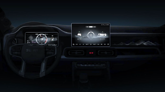除了外观设计之外,“情感硬核”也提现到了车内的方方面面。内饰同样采用了的大量圆角矩形设计元素,并且融合了北京越野的新一代越野智能座舱设计。10.25英寸全液晶仪表、12.8英寸中控屏幕以及HUD抬头显示系统,汽车智能化浪潮下的关键设计元素,北京越野BJ60一样不少。