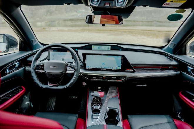 当我将车辆背对着连片的丹霞地貌停好后,特意看了下这个全新的红黑的撞色设计,你还别说,真有点儿那意思,不过这颜色要是能再拉低点儿饱和度就更像了。