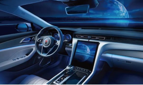 来到车内,全新红旗H5的内饰采用与外饰相呼应的中轴布局,中控台线条由中央的内嵌式屏幕向两侧发散,并与车门面板相连接,形成更加专属的环抱式设计。此外,全液晶仪表盘的尺寸目测也很可观,搭配12.6英寸竖状屏幕,进一步提升车内的科技感。